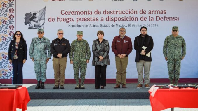 Antes, la gobernadora junto con el alcalde y las autoridades estatales, en la explanada del palacio municipal encabezaron la Ceremonia de Destrucción de Armas de Fuego, puestas a disposición de la Secretaría de la Defensa Nacional, donde se demolieron 112 armas decomisadas en distintos operativos realizados en la entidad mexiquense.