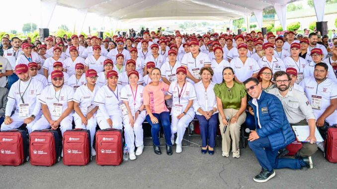 La Presidenta Claudia Sheinbaum Pardo y la Gobernadora Delfina Gómez Álvarez encabezaron la asamblea “Salud Casa por Casa”, programa que beneficia a un millón 824 mil 688 adultos mayores y personas con discapacidad; además, entregaron maletines con material e instrumental médico a trabajadores de la salud, quienes realizarán estas consultas periódicas domiciliarias.