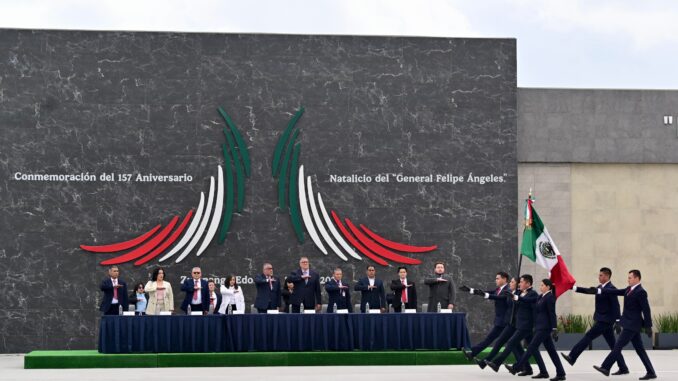 Durante el acto, el encargado de la política interna del EdoMéx, afirmó que el legado del General Felipe Ángeles —militar, revolucionario y humanista— constituye una guía de transparencia y convicción para el actual Gobierno del Estado de México, en sintonía con los principios de la Cuarta Transformación.