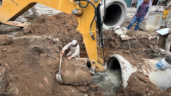 Debido a su poca profundidad, a la circulación de vehículos pesados y al tratarse de un material inadecuado, esta tubería registró un colapso en un segmento de 3 metros. De inmediato, personal municipal se ocupó de la limpieza y aseguramiento de la zona.