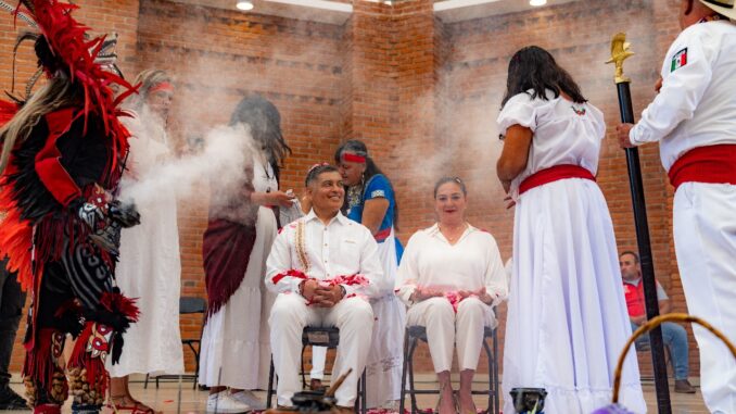 Durante un ritual, David Sánchez, acompañado por la presidenta del DIF Municipal, María de Lourdes González Ocampo, recibió el bastón que representa el respeto y la responsabilidad de quien lo porta. Asimismo, simboliza el compromiso de servir a la comunidad con honestidad, justicia y dedicación al bienestar colectivo.