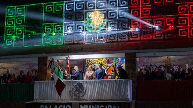 Previo al Grito de Independencia, los asistentes disfrutaron de un videomapping que iluminó la fachada del palacio municipal con imágenes alusivas a la historia de México.